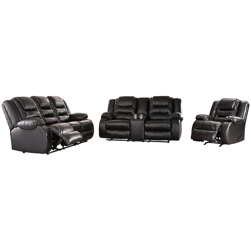 When it comes to comfort, style and value, this faux leather living room set with reclining sofa, reclining loveseat and rocker recliner in black rocks. Tailored for feel-good flair, its fashion-forward bustle back design is enhanced with sculpted padding on the headrest for cradling support. Channel cushioning along the sides flows into thick, wrapped pillowtop armrests that are truly over the top. And while it might look like you broke the bank, a sumptuously soft leather-like fabric keeps indulgence well within budget.