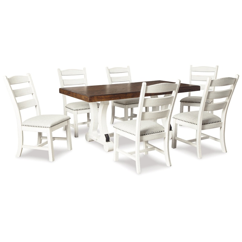This 7-piece dining set serves up the best in rustic farmhouse living. Two-tone distressed finish pairs a brown tabletop with vintage white base for a double helping of charm. Extension dining table features an extra thick edge with book matched inlay veneer. Six distressed white ladderback chairs upholstered with cushioned seats wrapped in a soothing gray linen colored textural fabric with nailhead trim are something to savor.