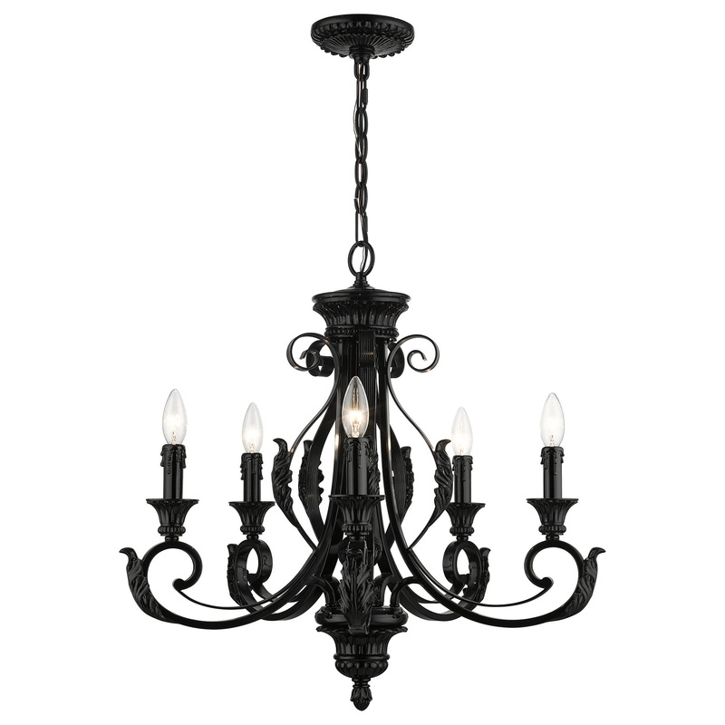 The Valencia is a classically inspired fixture with an overlapping leaf pattern and graceful curves. It is reminiscent of a European trestle though the elements of this piece are beautifully rendered in a shiny black finish, which creates a much more contemporary feeling. This five-light chandelier is perfect for any interior design style. Suspended in your living room, dining room or bedroom, this light will add glamour to your life.