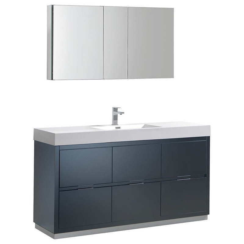 The Fresca Valencia Free Standing Modern Bathroom Vanity with Medicine Cabinet comes with everything you need to create an elegant and modern bathroom. The rectangular vanity offers great storage with six soft-closing drawers, just perfect for organizing all of your daily essentials. The drawers feature concealed aluminum handles and the cabinet has a stylish Glossy Dark Slate Gray finish. It rests on an aluminum base, adding to its modern look. The white acrylic-resin countertop/sink has smooth lines and a thick profile. The sink is equipped with an overflow, single hole faucet mount and includes a solid brass faucet. This ensemble also comes with a fully mirrored 50″ medicine cabinet with four adjustable glass shelves, to complete the look. This lovely vanity is available in multiple sizes and makes a stylish statement in any home.