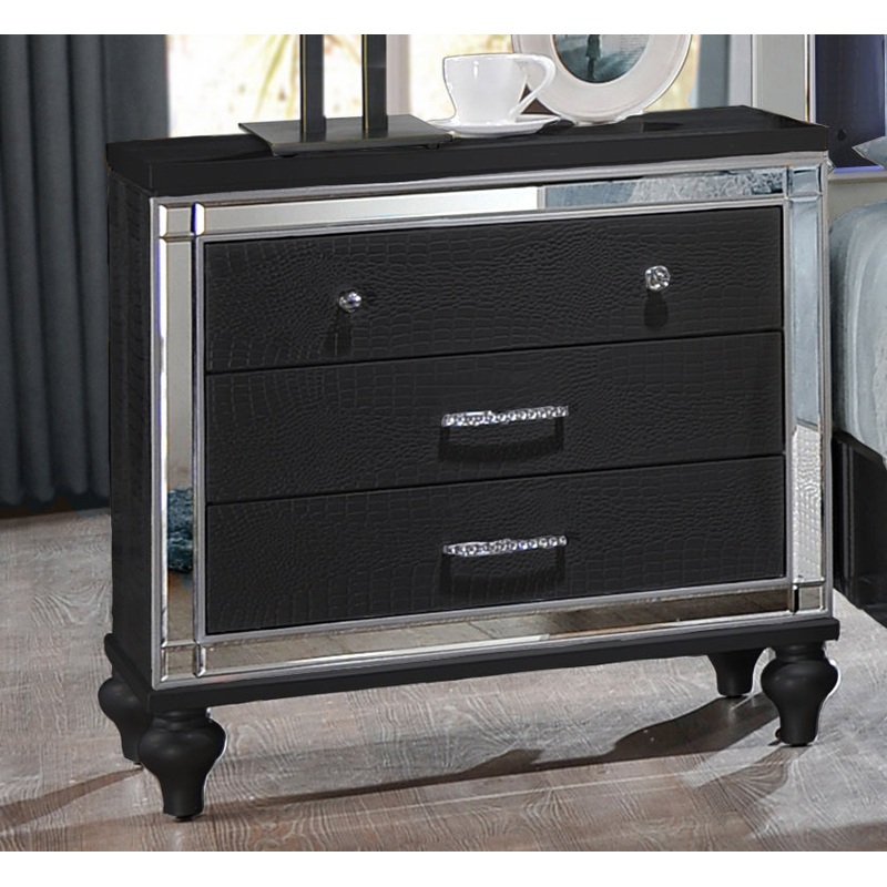 Valentino Furniture by New Classic FurnitureBlack finishHardwood solids and veneers3 DrawersEnglish dovetailMirrored accentFull extension glidesFaux crystal hardwarePulls and round knobs on drawersBun feet