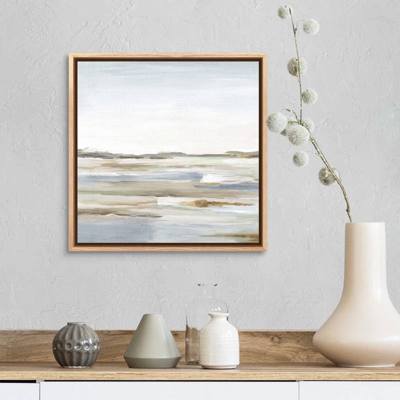 This painting print takes an abstract modern subject and re-envisions it to form a breezy, coastal landscape along the blue ocean waters. Designed by artist Eva Watts and printed in the USA, this watercolor-inspired giclee print is titled “Vastness II” and features a tan, light gray, and off-white color palette for a minimal yet eye-catching accent. Machine-made using UV-resistant archival inks, this artwork is able to reside anywhere in your home, even in direct sunlight. Wall-mounting hardware is included, so you’re able to hang it up right when it arrives. Wade Logan Size: 17.25″ H x 17.25″ W x 1.75″ D, Format: Natural Floating Frame Canvas
