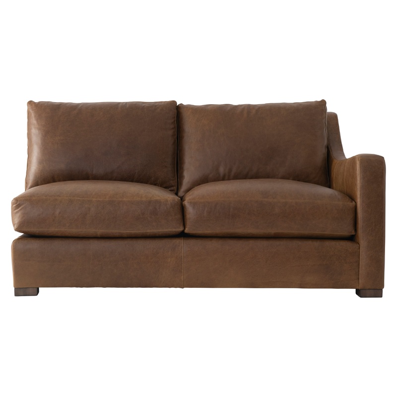 Clean lines and graceful curves blend modern and traditional shaping for the Ventura leather right arm loveseat. The arm gently swoops from a tall back and then takes a straight line to the floor. Two deep seat cushions and box-edge bordered back pillows p