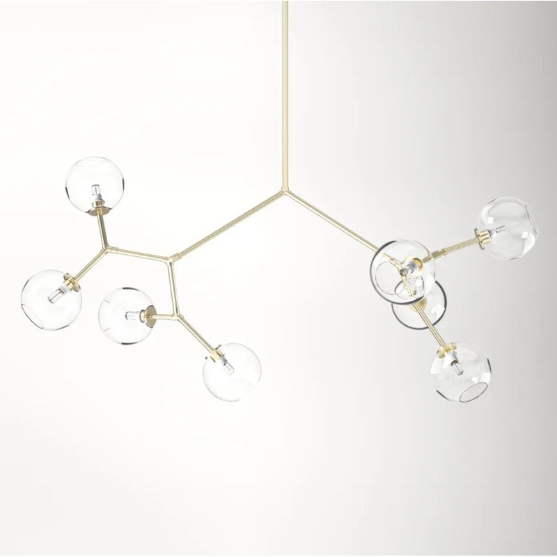 This chandeliers eight glass globe shades sprawl out on branching arms, diffusing light in every direction + creating a bold organic silhouette. Its built from sturdy steel in a polished gold finish and hangs at an adjustable height. Pair it with a dimmer