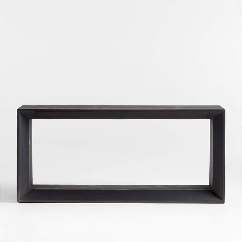 Like a picture frame, our Vernon console table uses mitered corners and angles to bring focus to the beauty of ebonized wood and pure lines. Made of pine with a dark ebonized finish, the table incorporates a reverse bevel and waterfall edges to outline an open, eye-catching rectangle. Precise woodworking integrates two drawers seamlessly into the frame to keep the lines ultra clean and modern. Light wirebrushing lends texture while highlighting the wood’s cathedral and quarter-sawn graining. The Vernon ebonized console table is a Crate & Barrel exclusive.