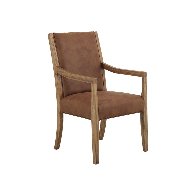 Upholstered Dining Armchair. The Verona armchair is expertly crafted from pine wood, offering a beautiful blend of style, durability, and natural elegance. It features a light brown-stained frame, gently curved armrests, and gracefully tapered legs. The seat and backrest are upholstered in a faux leather, adding warmth and comfort to its refined design. With its timeless aesthetic and inviting texture, this chair perfectly balances classic craftsmanship with everyday functionality, making it ideal for cozy reading corners, stylish office settings, or as an accent piece in any modern living space.