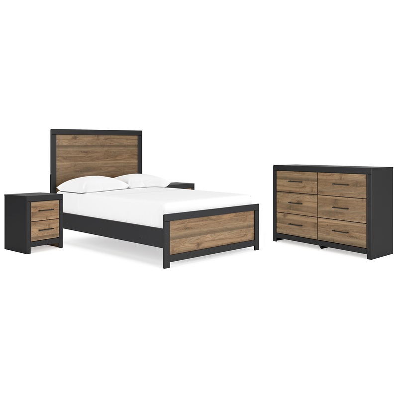 Relaxed yet striking, this bedroom package brings casual beauty and function to your dream destination. A delightful two-tone treatment blends a fresh replicated walnut grain with a matte black finish, lending a contemporary touch to this set.