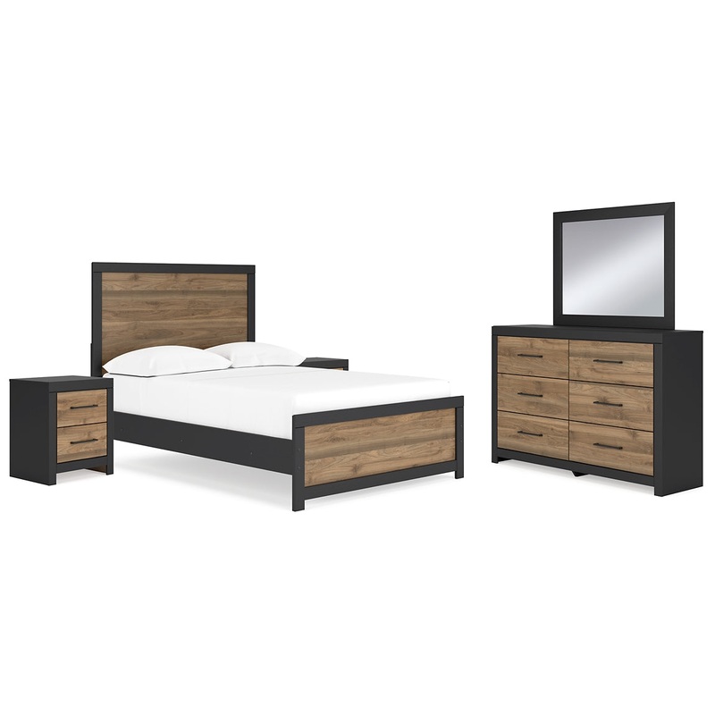 Relaxed yet striking, this bedroom package brings casual beauty and function to your dream destination. A delightful two-tone treatment blends a fresh replicated walnut grain with a matte black finish, lending a contemporary touch to this set.