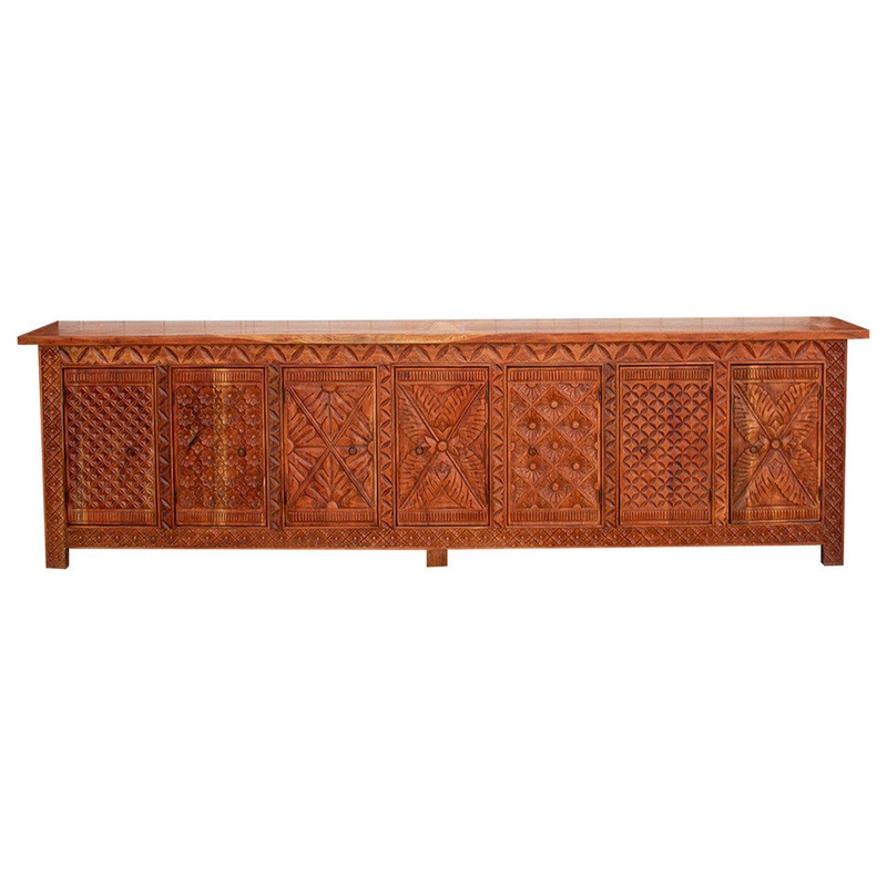 Hand-carved from reclaimed wood, this impressive buffet sideboard is a masterpiece which will be treasured for a long time. It features a natural aged fruitwood finish, it has seven carved cabinets each with distinct tribal and geometric carved motifs. Eac