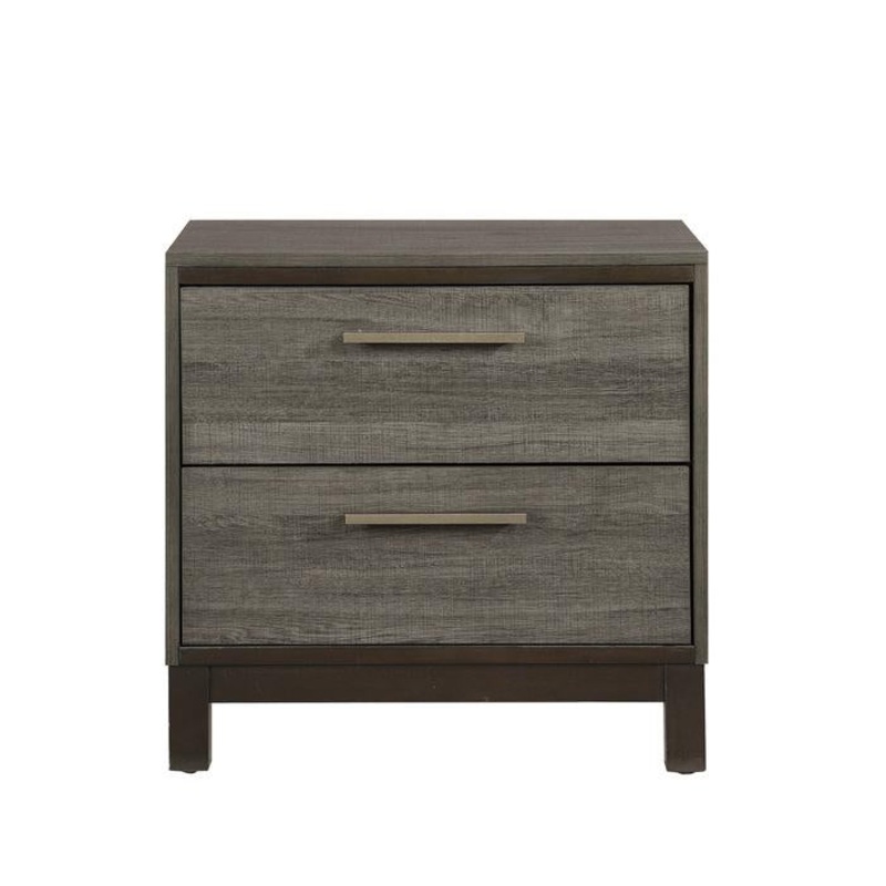 The contemporary styling of the Vestavia Collection provides a unique platform from which to redecorate your bedroom. Faux wood printed veneer provides subtle texture and a gray finish perfectly contrast the dark brown base rail of the nightstand. Clean li