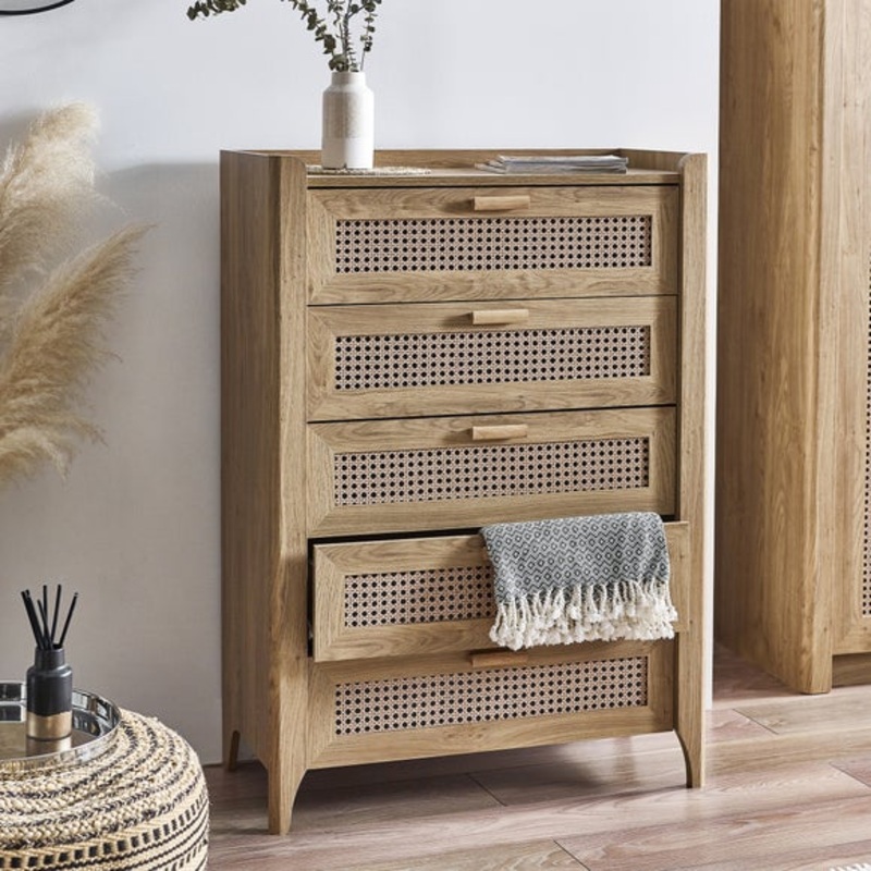 Rattan designCurved edgesOak FrameThis chest combines sleek design with a bohemian feel, featuring five spacious drawers for ample storage. The exquisitely curved edges and rattan-effect sticker front add a unique charm, while the natural oak effect finish