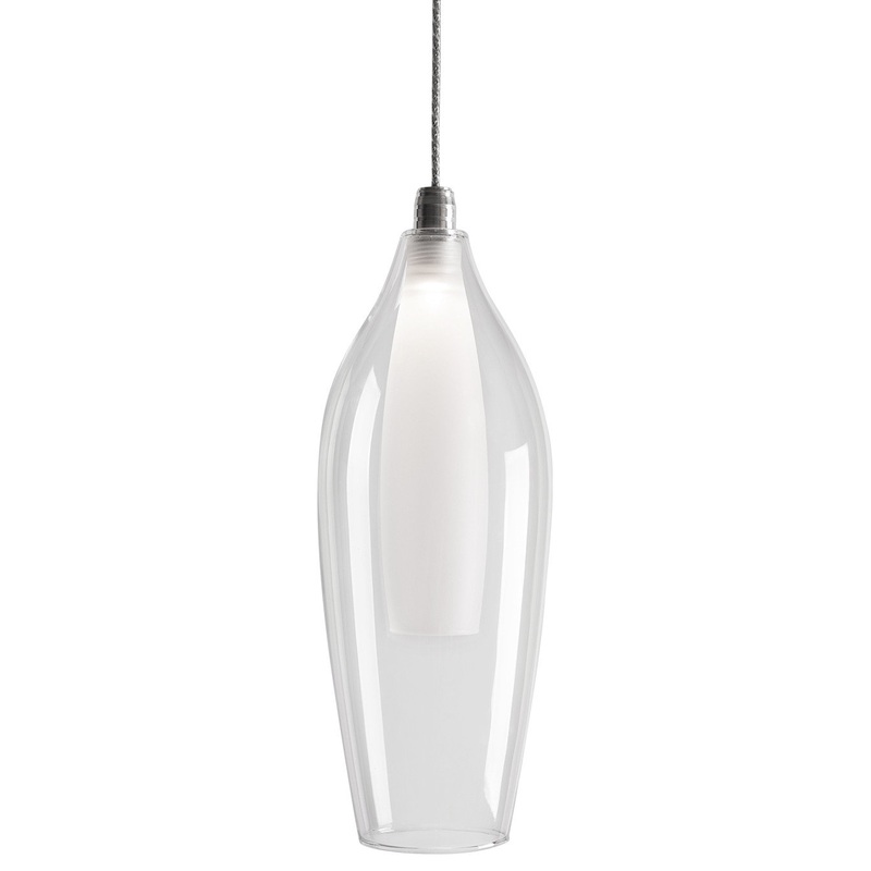 PENDANTS -Simplistic elegant single LED pendant with a slender drop clear outer glass and frosted inner glass set together as one piece. New patent pending socket design and Kuzco SSL wire allow this fixture to be 120V AC LED, 2W, fully dimmable. Metal details in chrome finish with maximum length of 120″ adjustable wire. Available in three different glass styles and a variety of multi-pendant options, see series for full details.