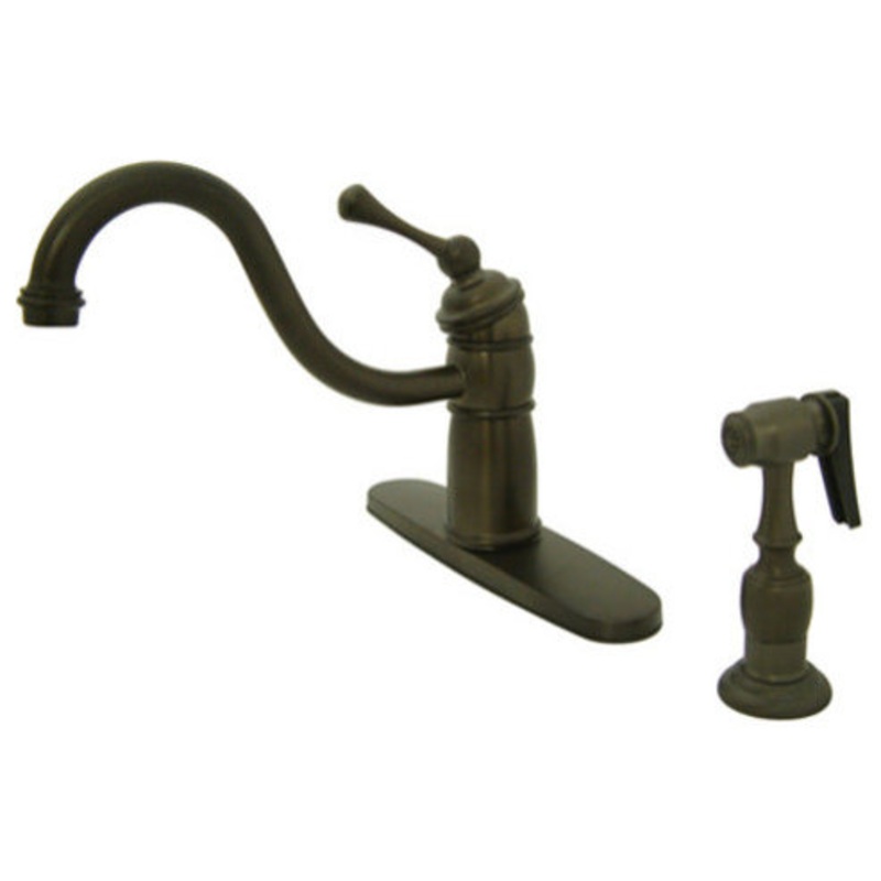 Kingston Brass KB157.BLBS Features: Covered under Kingston Brass’s 10 year limited warranty Faucet body constructed of brass Coordinates with products from the Victorian line Single hole mounting type Deck mounted faucet installs directly to sink or countertop Swivel spout rotates 180 degrees which allows for greater access to all areas of the sink Single lever handle controls the flow and temperature of water Side spray included – diverts water to sprayer to aid with a variety of kitchen tasks Includes ball cartridge Complies with ADA standards Low lead compliant Kingston Brass KB157.BLBS Specifications: Height: 9-1/4″ (deck to top of faucet) Spout Height: 9-1/4″ (deck to spout outlet) Spout Reach: 9-1/8″ (center of faucet body to center of spout outlet) Flow Rate: 1.8 gallons-per-minute Faucet Holes: Single Hole Faucet Centers: 8″ (distance between centers of outside faucet holes) Faucet Hole Size: 1.5″