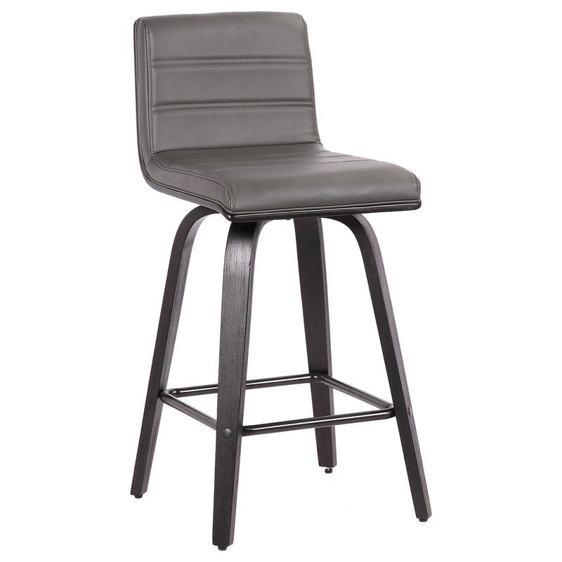 Indulge in luxury with the Vienna contemporary swivel barstool by Armen Living. It is beautifully designed with a sturdy metal framed footrest in expertly crafted in curved black brushed wood finish, upholstered with Grey Faux Leather and Wood Back. This piece provides both versatile style and comfort with a mid-century modern design that can easily be integrated into your home’s current decor. Available in 26″ counter height and 30″ bar height.