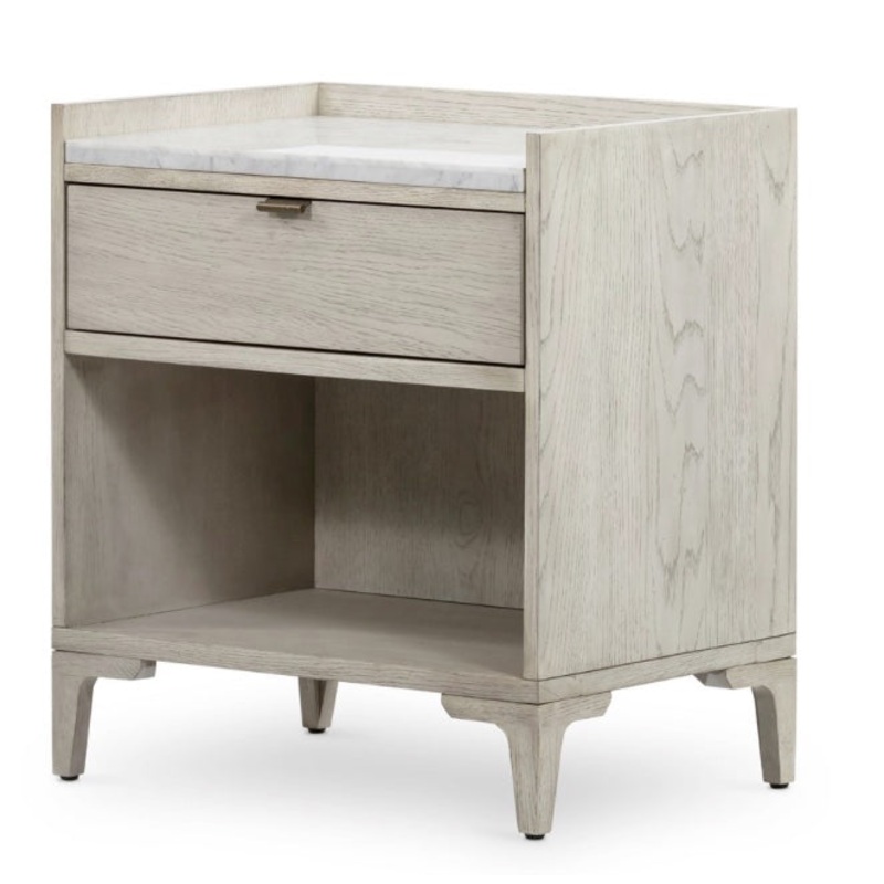 Vintage white oak is finished with a dry hand for a light look, while a top of white Italian marble offers a sophisticated material mix. A spacious single drawer plus open lower shelving brings plenty of storage space to the bedside.Overall Dimensions: 24.