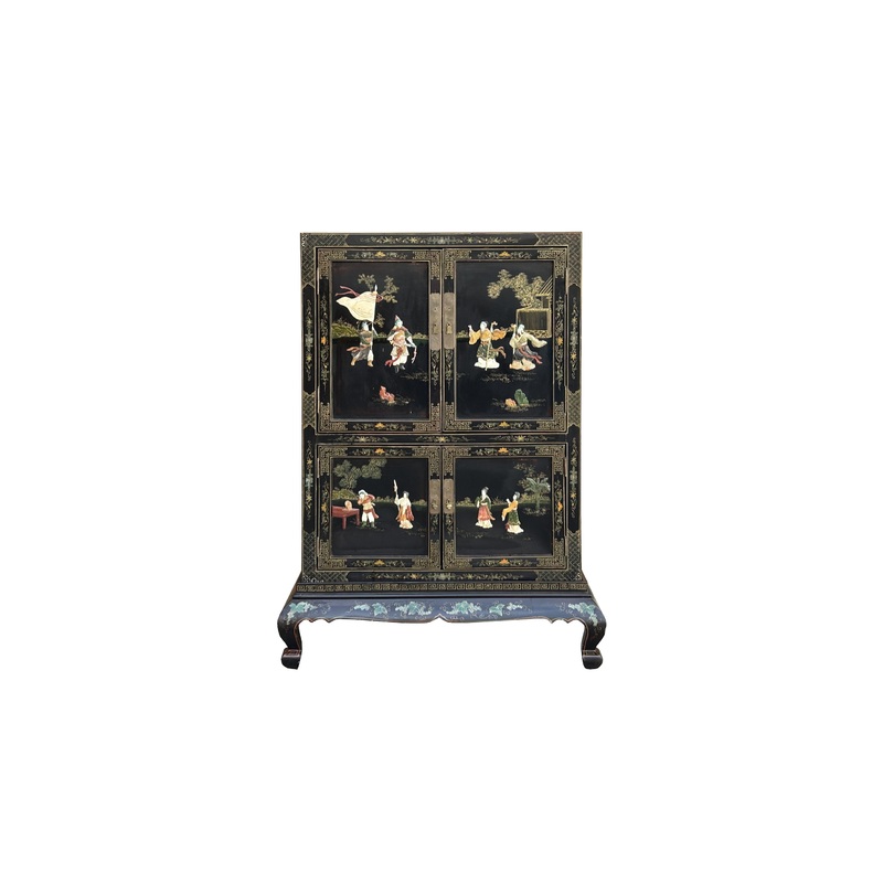 Imagine a vintage Chinoiseries credenza storage cabinet, exuding timeless elegance with its black lacquer finish and exquisite stone inlay depicting intricate people graphics. This piece of furniture embodies the allure of traditional Chinese artistry fused with functional design.