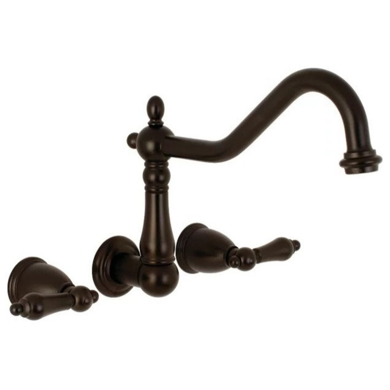 -Solid brass construction -Drip-free ceramic disc cartridge -Wall mount 8" center 3-hole installation -1.8 GPM/6.8 LPM spout flow rate at 60 PSI -5/8" O.D. Compression -9-1/16" Spout reach; 11-5/8" from wall -4-7/8" spout clearance from handles -7-15/16" s