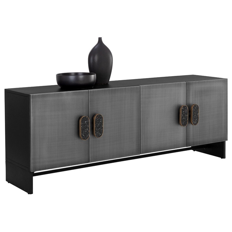 Add a cool and moody atmosphere to your dining space with the Viserys Sideboard. Features a black powder-coated frame and black terrazzo marble handles. Antique zinc iron doors add a faded lived in look to the piece.