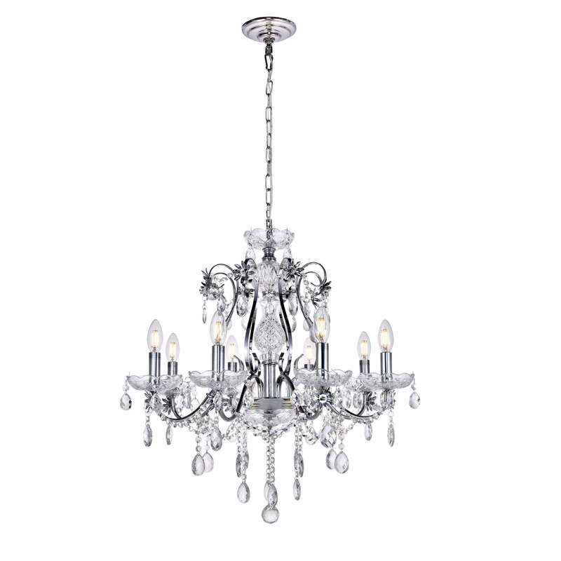 Glamour has never been this enlightening. Voltaire collection hanging fixtures are reinventing the classical chandelier. The graceful frame in a gleaming Chrome finish forms swirling arms that are underscored by dangling festoons of clear Crystal octagon strands and sparkling clear royal-cut Crystal teardrop pendants. An ornate pressed-Glass center column with corresponding bobeches contrast with the tapered Metal flower-shaped accents. With two alternate size options, these chandeliers are ideal for a dining room, stairwell, living room, or bedroom.