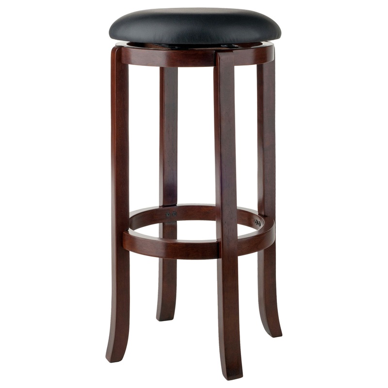 Add a graceful, yet casual look to your dining area, kitchen, or game room with the 30" Walcott Swivel Bar Stool. The comfortable cushioned seat is made of Black PVC, and the Solid Wood frame is finished in a handsome Walnut. The stool seat swivels 360 deg