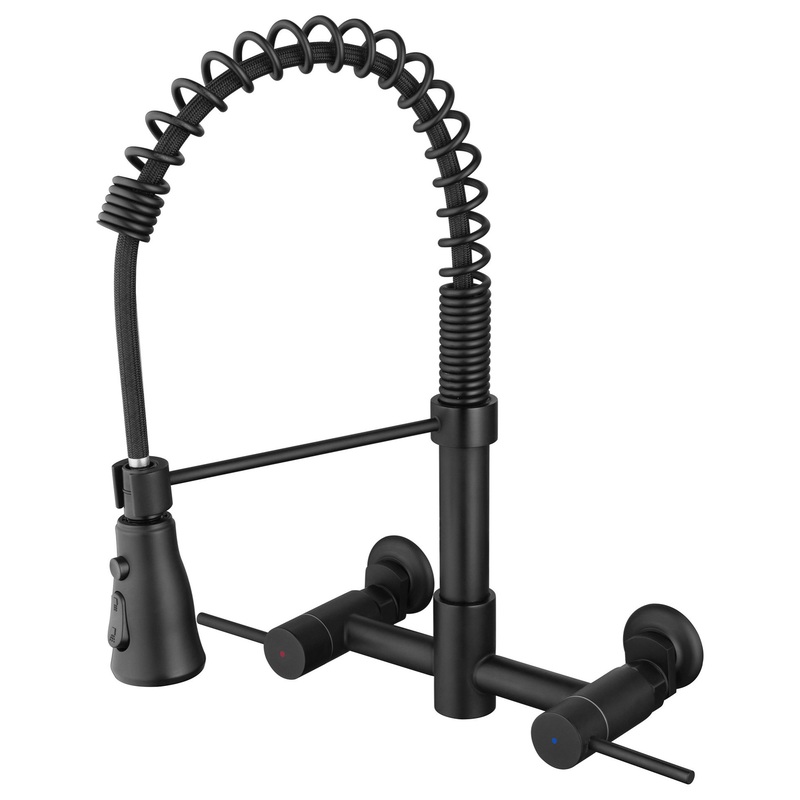 Inspired by the design of a professional kitchen, the Bridge Kitchen Faucet with 3 Function Sprayer and Spring Spout blends performance and style to help you build the kitchen of your dreams. The 3 function sprayhead with large non-slip rubber button switch allows you to easily shift among 3 functions. Soft rubber nozzles make the spray face easy to clean and maintain a lasting powerful flow. This faucet features a unique 90 smart handle to allow for an easy installation without the risk of impact with tile backsplashes. The faucet has a unique spiral detail that not only looks great but also secures the extendable hose into place when not in use. Exceptional in every way, the kitchen faucet is sure to be an immediate favorite in your home.