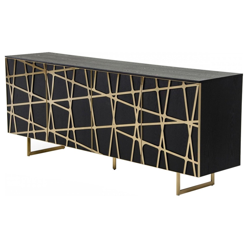 The Web Black and Gold Buffet, Glam Luxe Credenza, Black wood Sideboard - 79" is perfect for any room or space. The Web Black and Gold Buffet features a stunning Black Ash Veneer body completed with beautiful Champagne Gold Accents that crisscross all over