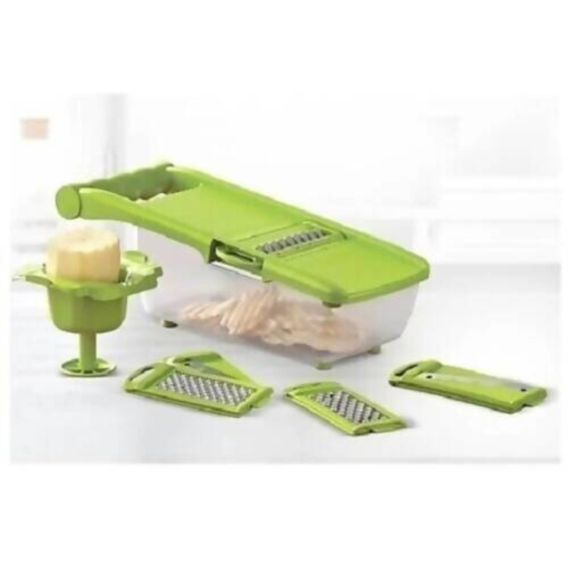 – Set Includes: Food Slicer, Fruit Cutter, Interchangeable Blades/Discs, Potato Peeler, Salad Cutter, Slicer, Vegetable Peeler 5 in 1 Slicer