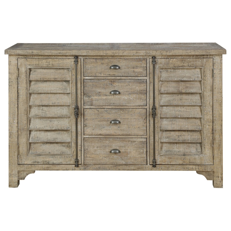 -The West buffet combines the rustic nature of reclaimed woods with classic silhouettes., featuring louvered doors, six shelves, and three drawers -Exemplifies rustic casual style in a sandstone buff color palette, bringing both personality and class to yo