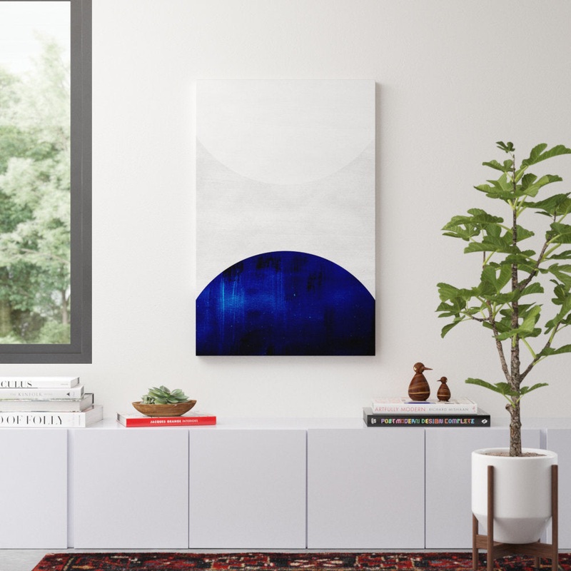 Want to add a pop of color to your walls without stealing the show? Try adding this piece of wall art. On a light gray canvas, it features a dome of royal navy blue on one side, and white on the other for a simple, Scandi-inspired piece. This piece is made