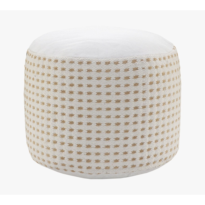 As decorative as it is functional, the pouf can serve multiple purposes admirably. Handwoven from organic jute and cotton, this pretty version features a pattern of dashes. Use it in spaces large or small as an extra seat, footrest, or side table.