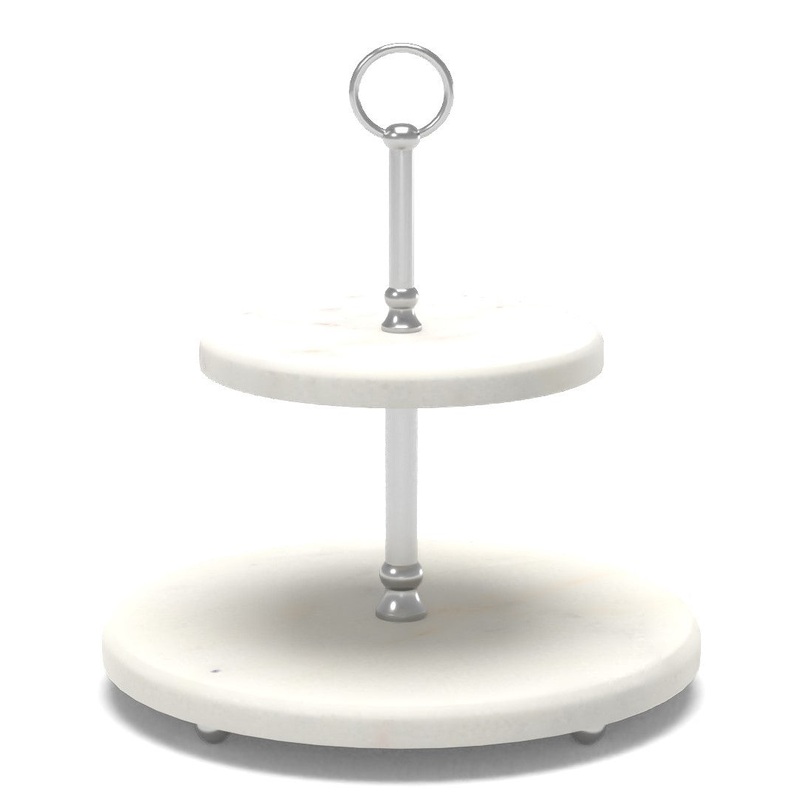 Polished white marble makes a bright and elegant base for presenting appetizers or desserts. This tiered stands simple design highlights the beauty of the durable stone, and is paired with an antique-pewter finish on the stem for handsome contrast.Handcraf