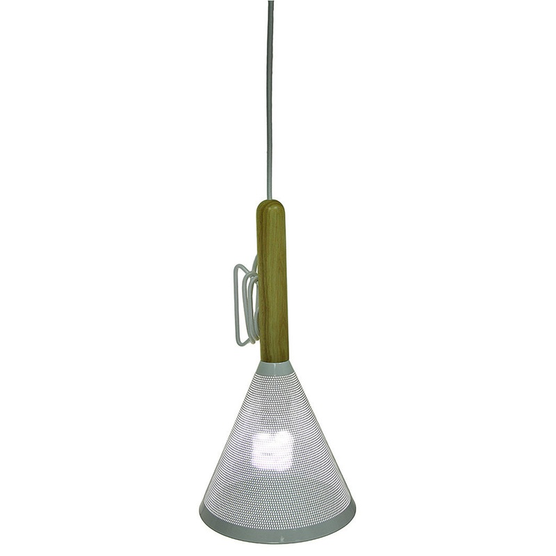 -In-Line Rocker Switch On CordA minimalist design with a white metal mesh cone shade and a wooden stem, let this light hover above your dining table, kitchen counter, or sheltered porch chair to bring a bright glow and an industrial vibe to your decor. It includes a 23-watt CFL bulb that emits 1600 lumens of brightness with a 2700K soft white temperature rating that lasts up to 10,000 hours. It easily turns on or off via the rocker switch on the 16-foot fabric-covered cord. Stylish, utilitarian, and simply elegant, this 18-inch long, 9-inch diameter (46×23 cm) pendant lamp will light up any room or office.