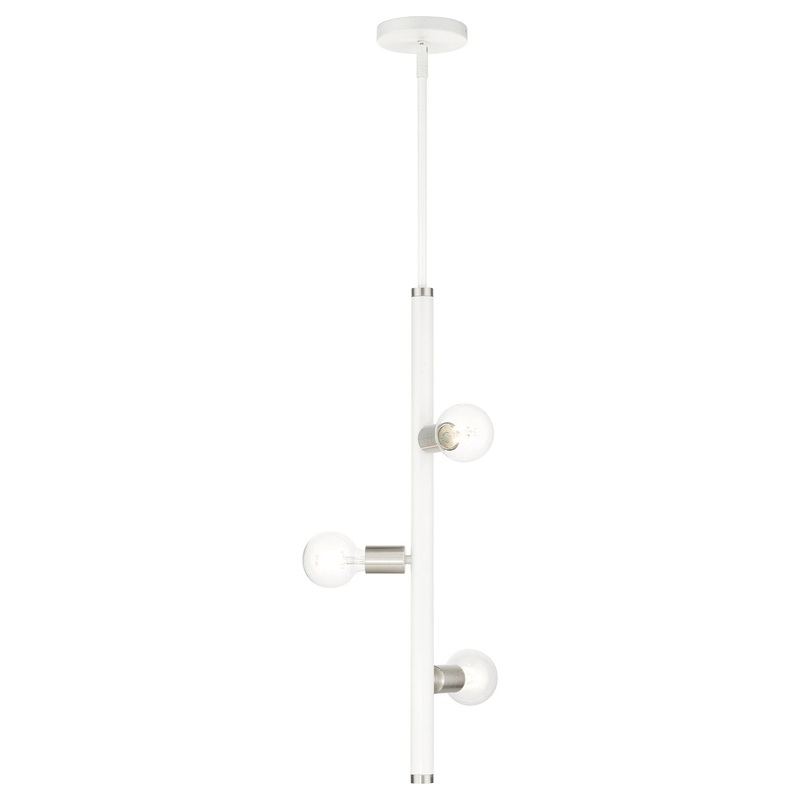 Simplicity and attention to detail are the key elements of the Bannister collection. The dimensional form, exposed bulbs and combination of finishes adds a playful mood to a contemporary or urban interior. This three-light asymmetrical pendant design gives a new face to a kitchen, bedroom or a bathroom vanity. It is shown in a white finish with brushed nickel accents.