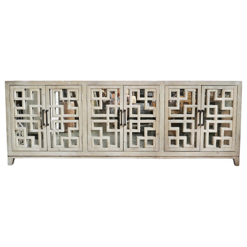 White wash finish reclaimed pine wood sideboard. Vintage style carved doors with mirror backing and iron handles. Each may vary slightly in exact wood tones/finish, grain, and natural imperfections. This cabinet weighs approx. 220 lbs. Product ID200120303M