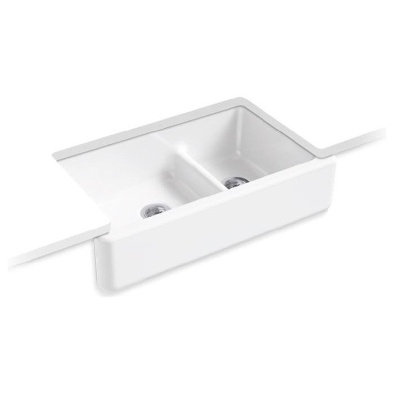 The Whitehaven apron-front kitchen sink features a streamlined and versatile farmhouse style to complement any decor. The Self-Trimming(R) design requires only a simple rough cut, overlapping the cabinet face for beautiful results. The sink is designed to fit in most standard 36-inch apron-front cabinetry. A low barrier divides the two compartments, making it easy to wash and rinse large items while still keeping the two basins separate. Crafted from enameled cast iron, this sink resists chipping, cracking, or burning for years of beauty and reliable performance.