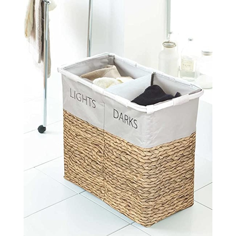 Wicker Print Lights and Darks Laundry Hamper Clothes Storage Bin Two CompartmentsThe two compartment "Lights & Darks" baskets are made with a sturdy foldable metal frame. This is a wicker print and is made of material, it is not actual wicker wood.Easily f
