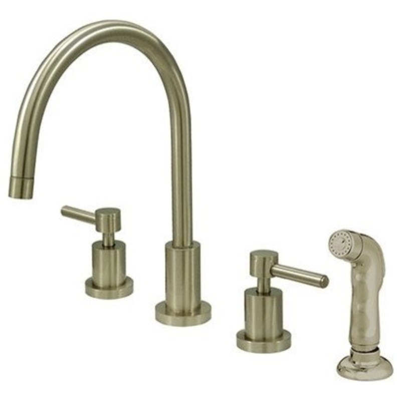 The Concord look features state-of-the-art glamour with its line of lavatory and kitchen faucets. This double handle widespread kitchen faucet features a long C-spout and cylindrical designs adopted from the Concord collection. A non-metallic sprayer is in