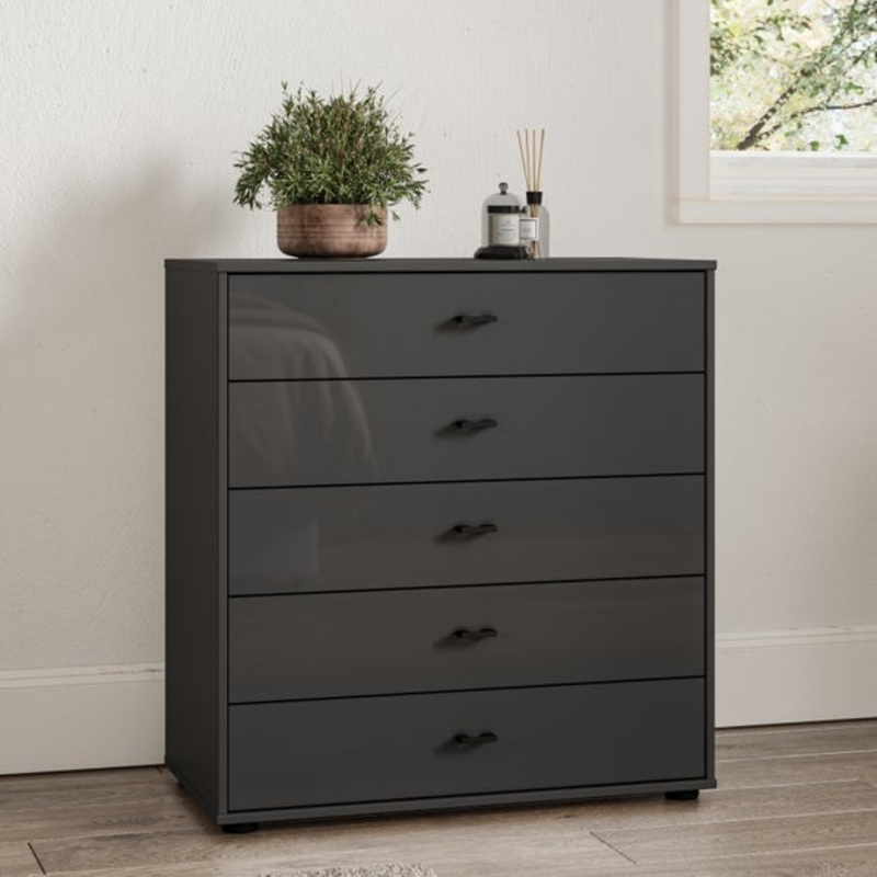 Experience elegance and practicality with the Kahla Glass Fronted Large 5 Drawer Chest. Available in a choice of trendy colours, this chest boasts modern slate coloured handles, adding a touch of sophistication to the glass fronted drawers. Designed with longevity in mind, this piece is crafted with highly resilient metal fittings and scratch resistant fronts. Delivered fully assembled, the Kahla Chest of Drawers will seamlessly integrate into your bedroom space, and provides plenty of storage.