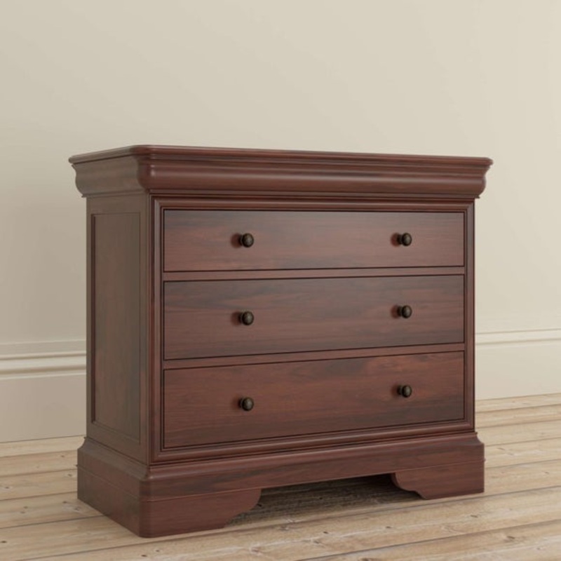 With its generous proportions and elegant design, this wide chest of drawers is ideal for storing everything from clothing to linens. It features three spacious drawers, including one extra-deep for bulkier items, and a hidden velvet-lined drawer for added luxury. The dovetail joints and classic hardware reflect its timeless appeal, making it a beautiful and practical addition to any bedroom.