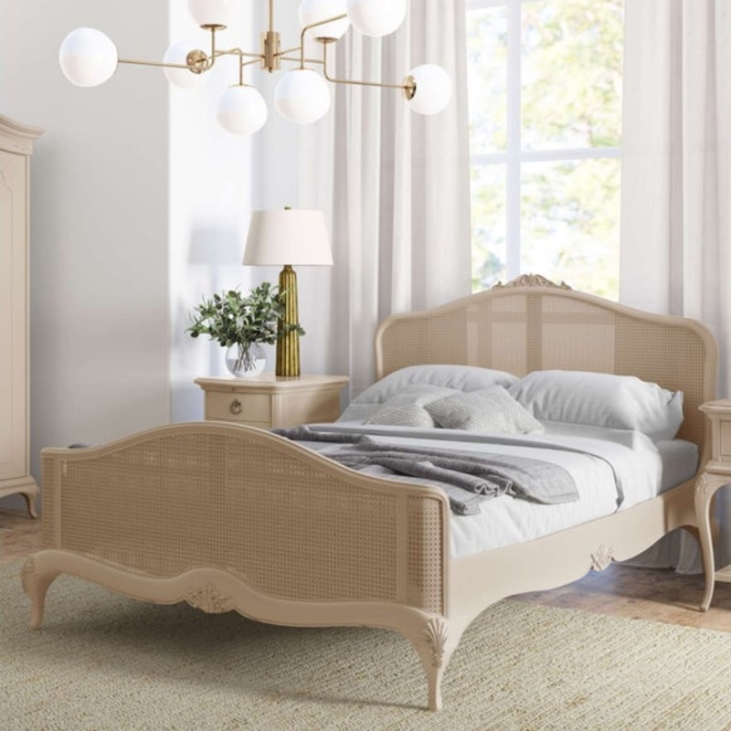 Solid poplar and Birch veneer frameRattan detailingSoft painted finishCarved detailingSprung slatted baseThis bed frame is a beautiful blend of comfort and classic design. The rattan panels and carved wooden frame are finished in a soft, distressed tone th