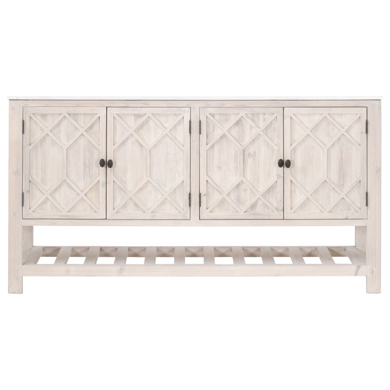 This exquisite quartz-topped media sideboard can also function as a dining sideboard or entryway cabinet. It is constructed with a solid quartz top designed to resemble white and gray marble and a solid wood base with a white-wash finish. It features two large storage cabinets with a diamond design on the doors. Each cabinet has a single shelf and a cord management hole, allowing ample storage space and a convenient way to hide unsightly wires and devices. The trestle base ties in a touch of farmhouse style as well. This would make a beautiful addition to any living room, bedroom or foyer.