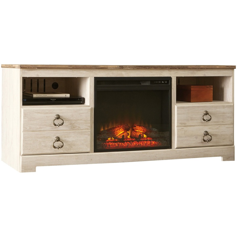 This TV stand with fireplace insert is the ultimate statement piece for a coastal cottage or shabby chic inspired retreat. Whitewashed finish is wonderfully easy on the eyes. Paired with the TV stand's unique plank-style top, it's a driftwoody look that ha