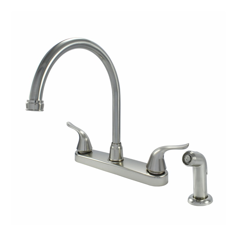 -Non Metallic Faucet -High Quality Washerless Cartridge for Durability and Reliability -High Spout for added clearance and reach -Double Handle -Matching Spray -Brushed Nickel Finish -8" on Center Installation -Flow rate: 1.8 GPM -Easy do-it-yourself Insta