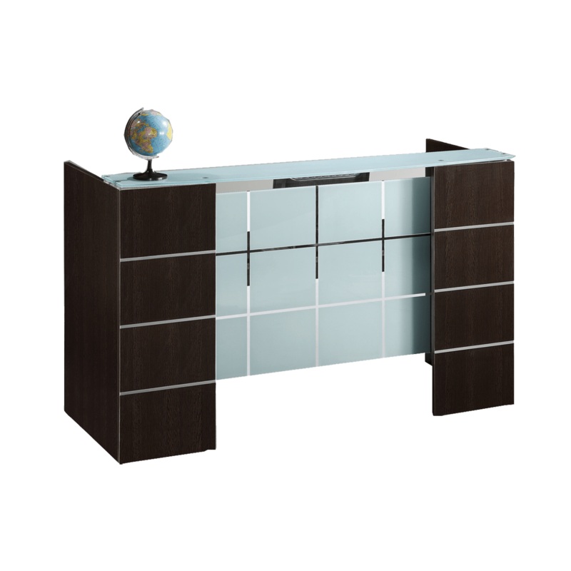 The wood reception counter is a real eye-catcher. Especially in corporate environment, the modern design and the decorative stripes in stainless steel look really stand out, especially in office reception area, the modern design and the decorative stripes