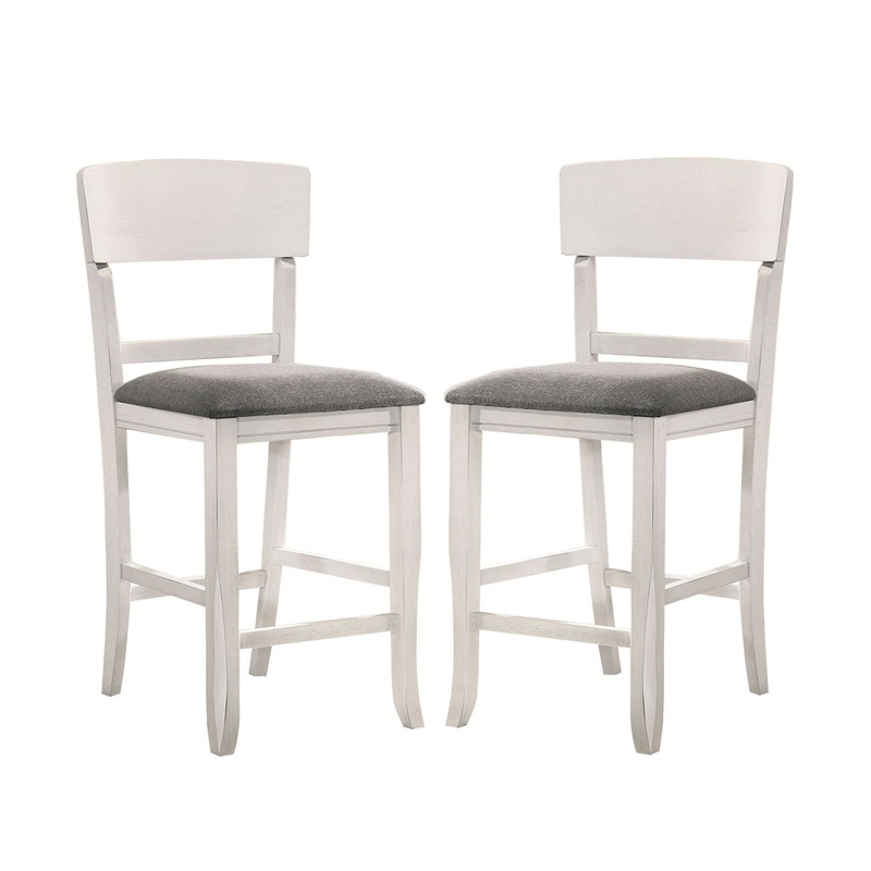 Wooden Counter Height Chair with Curved Back, Set of 2, White and GrayAdd an elegant style to your home with the inclusion of this Counter Height Chair, available in a set of 2. It has curved design backrest and fabric padded seats for a more comfortable e