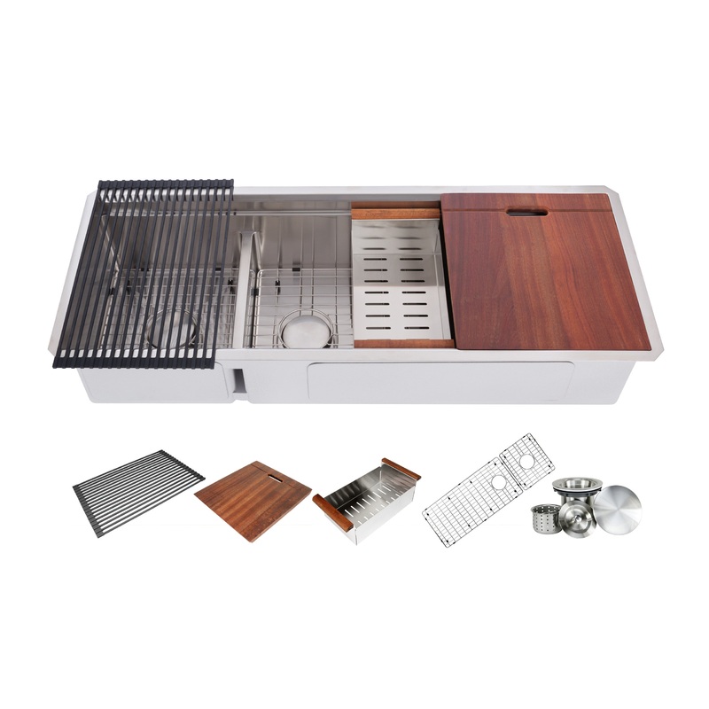 -Professional kitchen inspired workstation sinkThe Premium Workstation Package Includes: 1 x Stainless Steel Sink, 1 x Silicone Roll-Up Dish Rack, 1 x Durable stainless steel colander, 2 x Protective Bottom Grids, 1 x Deluxe Lift-Out Basket Strainer, 2 x Drain Hole Covers, 1 x Walnut Cutting Board, Cutout Template and Hardware.