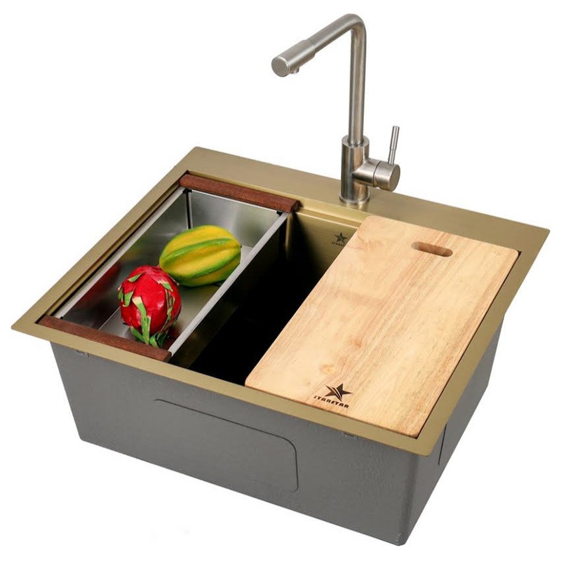 -Beware: Faucet is not includedStarstar Top-mount stainless steel sinks combine fashion with function to create a contemporary look for the kitchen. Handcrafted from premium 304 stainless steel for maximum durability, the extra-deep basins accommodate large dishes with ease. The four corners are creative more convenience to clean the dirt. The clean lines and Top Mount design complement any decor, from traditional to transitional to modern. All starstar kitchen sinks are equipped with top-level soundproofing, including thick rubber dampening pads. Each sink is additionally treated with protective pads to reduced the dampens sound. The corrosion-resistant surface is further protected from rust and oxidation by a meticulous finishing process. This stylish single bowl sink provides a lifetime of functionality. For added convenience, a basket strainer drain included free with purchase. For easy installation, all mounting hardware is provided. Experience Starstar High Quality and bring your kitchen bright to life.