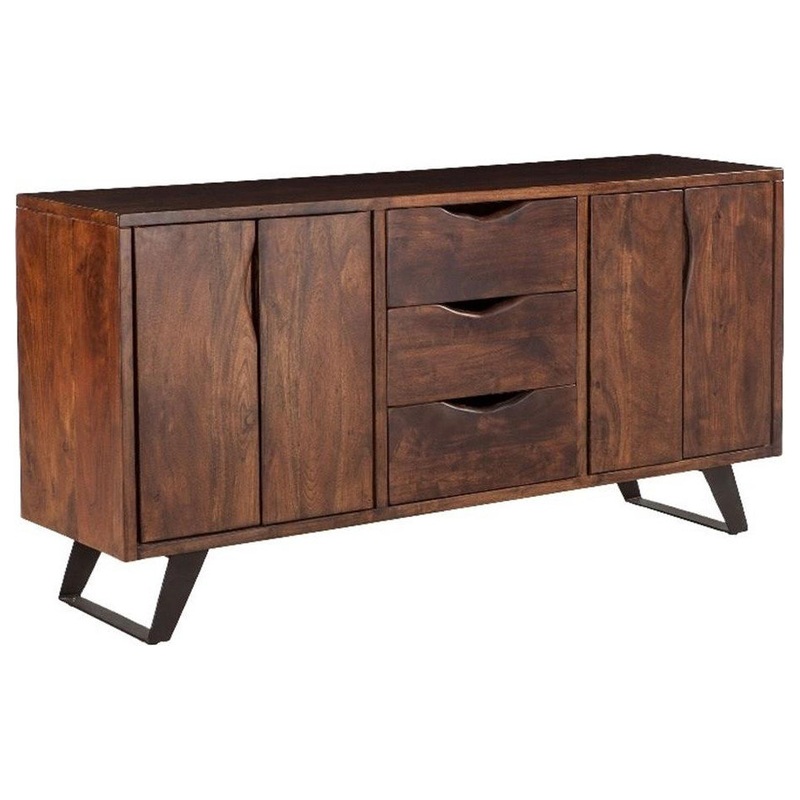 The Nottingham collection elevates mid-century modern to the next level with sustainable organic materials and modern design elements. Casual enough for a beachfront oasis, yet modern enough for a European loft style home, the Nottingham collection has furniture pieces for every room in your home. With a classic charm and air of sophistication, this hand-crafted sideboard is made solid acacia wood in a water-based catalyzed walnut finish that offers durability while showcasing the natural grain of the wood. With two cupboard areas lining the sides and three small drawers stacked in the center, each featuring a unique yet sleek cut-out handle, this sideboard provides plenty of room for housing all your favorite knick-knacks. The sideboard rests on a pair of U-shaped, black iron legs to create a fusion of natural and industrial elements. This pre-assembled sideboard is made with materials of the finest quality, making it the perfect addition to any living or dining area.