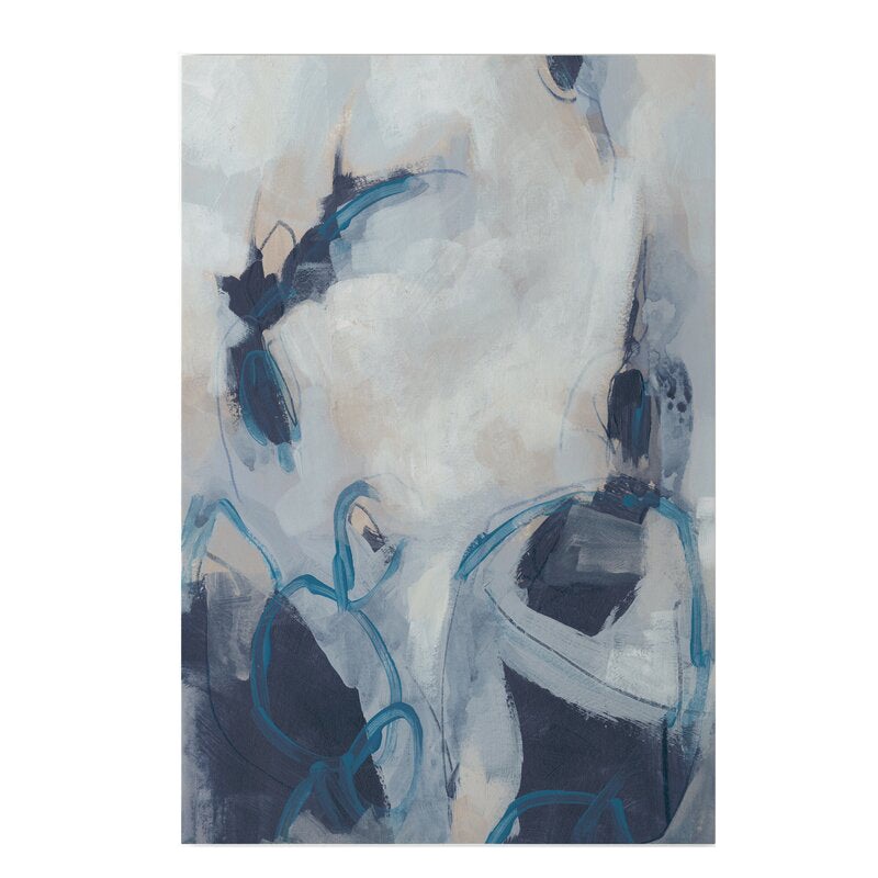 Add an artful look to your walls with this chic painting print. It features a series of fractals and swirling abstract designs in hues of dark blue, light blue, and ivory that freshens up the feel of your modern home. This giclee print is made in the USA, and it’s printed on canvas and stretched over a solid wood frame. It strikes a rectangular silhouette that can be hung vertically over the sofa or over the bed in the main bedroom or guest room. Best of all, it comes with two wall hooks, making installation a breeze.Giclee printHand-stretched canvasSolid wood stretcher
