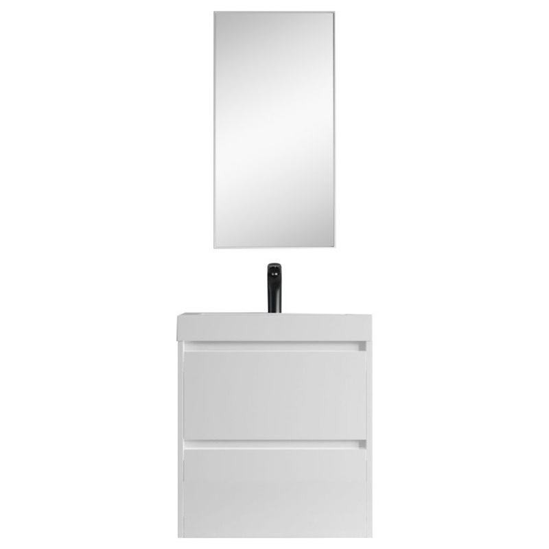 This wall-mounted bathroom vanity set is a stylish addition to any bathroom. It features two soft-close drawers and a white resin single sink basin with one faucet hole (faucet not included). This vanity is available in gloss white or matte black and is built to last. The drawers provide plenty of storage for all your bathroom essentials. The vanity set is designed to accommodate plumbing fixtures with ease (legs not included). Set includes vanity base and basin only.
